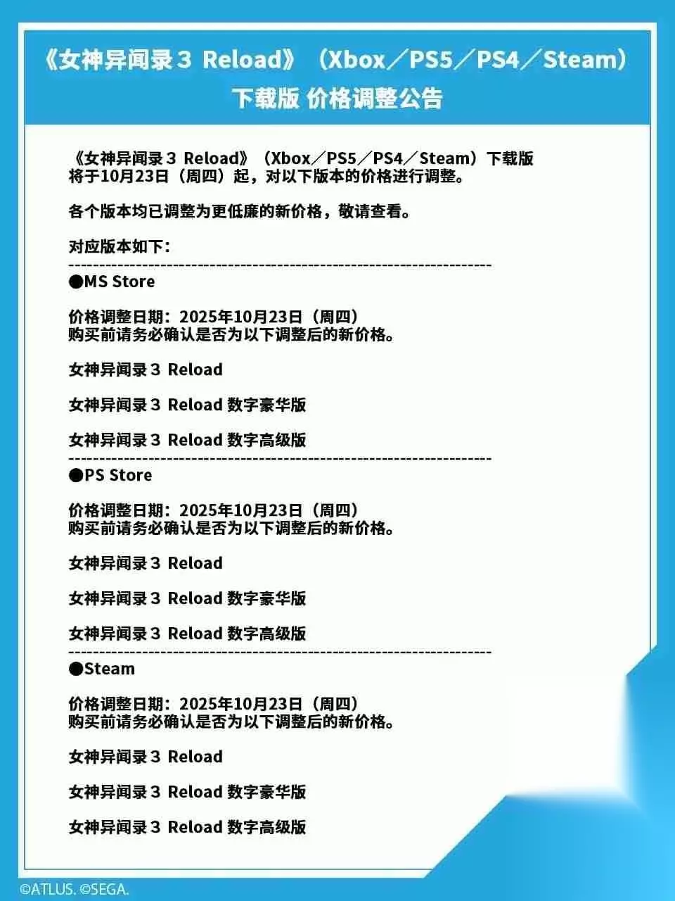 今日,世嘉官方发布公告,宣布altus旗下jrpg作品《女神异闻录3 reload》将于下周四(10月23日)起在多个平台实施永久性降价,涵盖xbox、ps4、ps5以及steam平台。