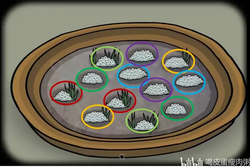 2、进去看到妹妹,玩傍边水盆的游戏,点击相同形状的蛙卵,消除所有图案,得到二号青蛙。接着在水盆这照镜子,获得成就【水面的反射】。