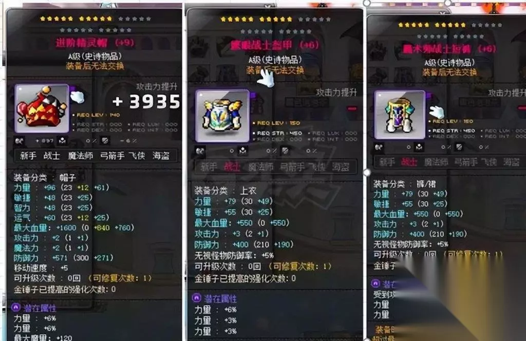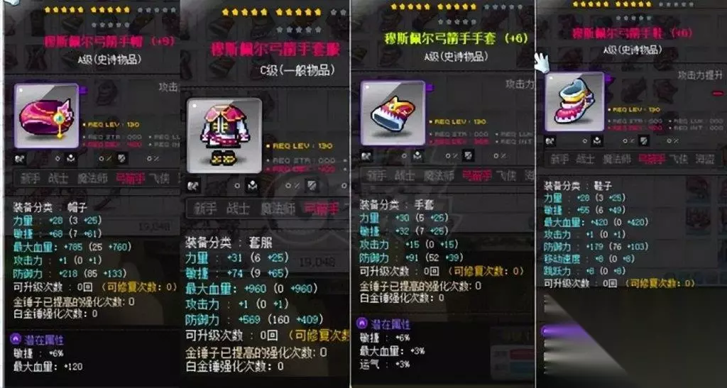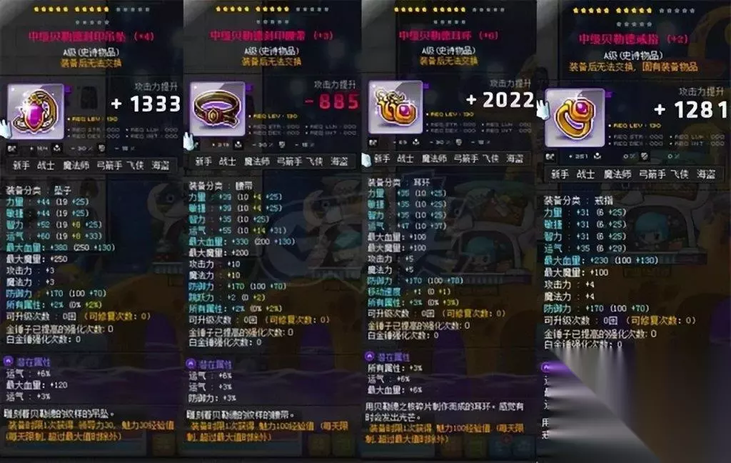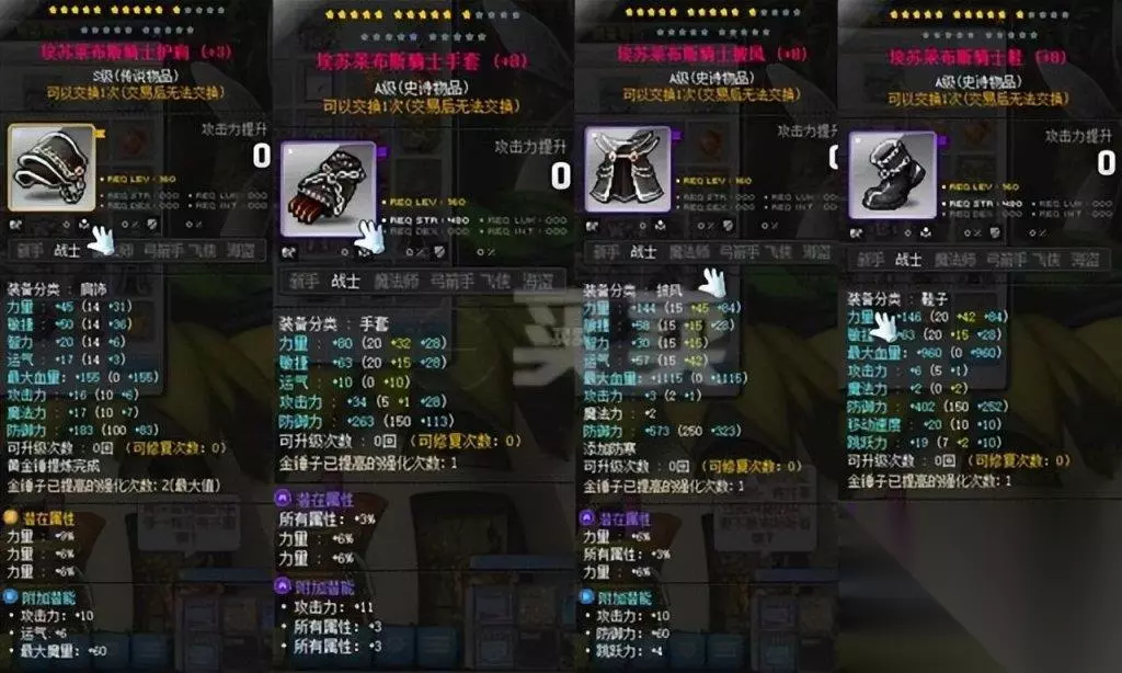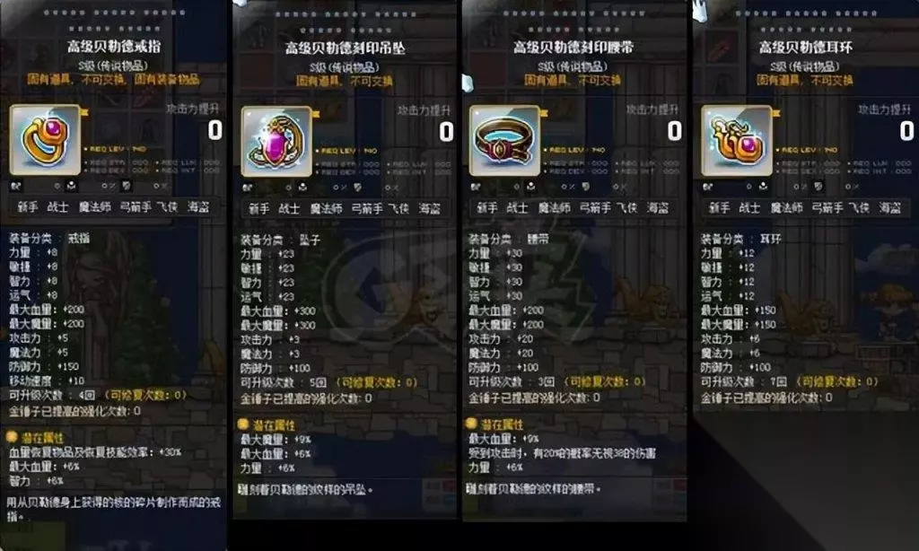 身披之甲,150级鹰眼盔甲最为合适,击败进阶半半,便可得到碎片,集齐五片便可披挂上阵。而裤装,则选取150级魔术师短裤,进阶皮埃尔的战利品中也可寻得碎片,同样五片便可交换。至于鞋履、披风、手套以及护肩,通常被视作一整套甲胄来考量,你可以选择漩涡套装或埃苏莱布斯系列。 漩涡系列可在140级的凯梅尔兹共和国航海冒险中,用航海币兑换而得。而埃苏莱普斯的门槛则更为高远,需要在斯乌的战斗中获得S核,或在黛米安的挑战中得到大磨湖材料,并且在避风港完成周长任务,以获得A核,方可在废弃营地的小模糊那里兑换。 其中,鞋履、披风、手套可在避风港兑换,而护肩则在废弃营地交换。另外,航海币还可兑换150级的凯梅尔兹护肩。而四傻战斗中得到的代币,也可用来换取150级的复古护肩。至于纹章,则在百级时,点开左侧灯泡即可直接领取。 对于副手,可在各村庄的辅助武器商店中购买三十、六十和100级之物,或者选择140级的银河系列,从打败浓姬中获得碎片,集齐十五片便可兑换。至于吊坠,则有500分赠送的140级S级高级贝勒德吊坠,另外还可以佩戴一个可交易的。