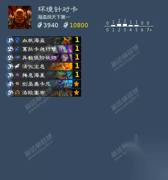 AAEBAQcH5Qf6DuTCAvqwA4vVA8eyBI21BAAA 这些卡可以根据环境以及个人偏好编入卡组,有利于提高胜率 血帆海盗:针对海盗贼,海盗贼现在非常依赖剑鱼,一张血帆出其不意,但是我们打海盗贼有返场手段,没有必须带的必要,如果分段海盗贼很多,可以带一张换掉港口匪徒。 葛拉卡爬行蟹:针对带海盗的快攻,但对手一旦不是玩海盗的抽到就比较伤,海盗战带海盗杀手蟹有没有信仰呀! 异教低阶牧师:针对德鲁伊,可以拖慢其启动一回合,打其他慢速卡组独有不错的卡节奏的效果,如果分段德鲁伊多建议换黑曜石铸匠带一张,带两张针对效果更好,快攻内战会难受一点。 活化龙息:针对战吼萨,但是极限快攻6费前还是很多机会抢死战吼萨的,抢不死基本已经走远了,一定要带就换一张暴风城海盗或者南海船长。 掩息海星:主要针对战吼萨,可过墙,但是我们的随从很多不是白板,不是解冻沉默自己很难受,很多时候不想出卡在手里难受,现在牧师都没有心急出猪的,基本针对不到牧师,不建议带。 剑圣奥卡尼:针对德鲁伊,黑猪牧,这种情况基本出场即可获胜,也可以针对法术解场,雪落,缺点是快攻内战难受,其他对局卡手,可以酌情带一张换掉船长**提高对德鲁伊黑猪牧胜率。 洛欧塞布:针对防战,德鲁伊,或者5、6费法术解场的卡组,关门叫杀,分段高了防战多了可以带一张。 !!!笔者给的卡组是初版卡组,没有带一张针对卡,每个分段环境不一样,针对卡怎么带最好笔者没有最好的答案,大家可以根据自己的偏好和理解来带,笔者目前是只带了一张剑圣,大家见仁见智,有好的想法建议欢迎分享讨论。 对局分析 起手必留牌:至少一张1费海盗除了海盗帕奇斯、对手职业的针对牌、空降歹徒、船载火炮、海盗之锚。 德鲁伊