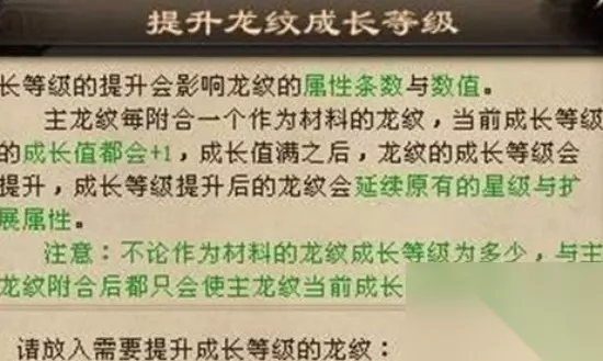 三、龙纹星级的提升1、当龙纹的星级低于五星时,可以通过消耗一定数量的【玉龙髓】来提升星级,可以从钧天王陵、罗浮王陵和潮京王陵的副本中击败"守陵监"获得。2、当龙纹的星级需要提升至7星时,玩家所在世族占领的城市达到一定等级,并且需要消耗【玉龙髓】和【勾天彩】两种材料。3、玩家在占领城市中可以每日领取【勾天彩】,并且通过参加属地争夺活动也能获得。四、注意事项1、提升龙纹从一星到二星需要消耗20个【玉龙髓】,由此可见获得极品装备是需要付出巨大代价的,请根据自身实力合理选择。2、玩家所在城市等级越高,获得的【勾天彩】数量越多。3、当龙纹的星级需要提升至8星时,需要玩家所在世族同时占领三座城市,并且这三座城市均达到5级。