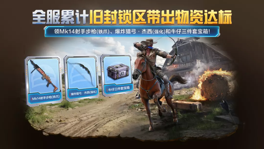 2025年12月19日-2026年1月4日,完成每日任务,共同参与旧封锁区,提升旧封锁区带出物资进度,可领取海量地铁币、Mk14射手步枪(铁爪)、爆炸猎弓·杰西(强化)和牛仔三件套宝箱等奖励。