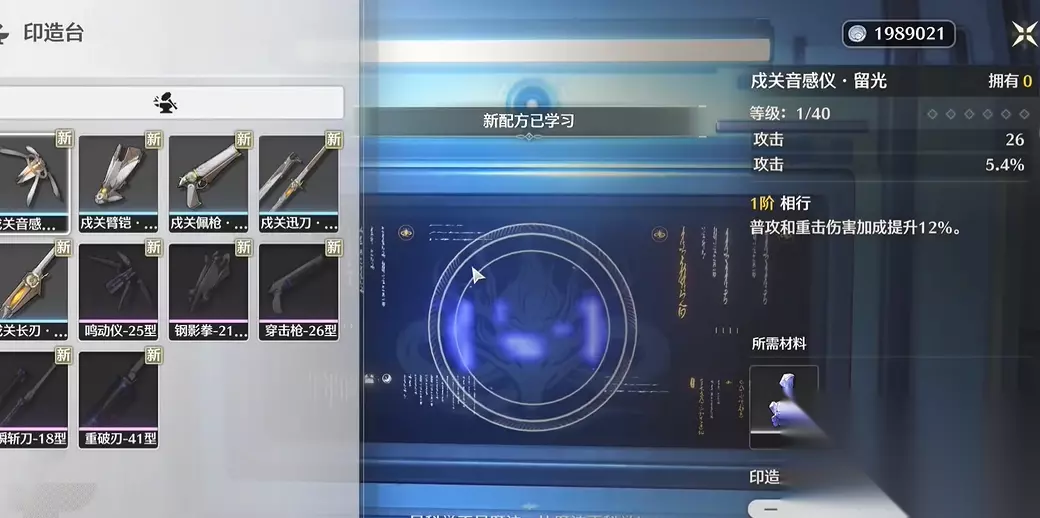 在这个锻造台可以打造出紫色的四星武器。在可选的武器中,有一把瞬斩刀比较受推荐,它非常适合角色丹瑾使用。而另一把穿击枪,由于其效果触发条件相对困难,所以通常不那么建议优先打造。这些可锻造的武器会提供不同的词条效果,比如提升共鸣效率等。