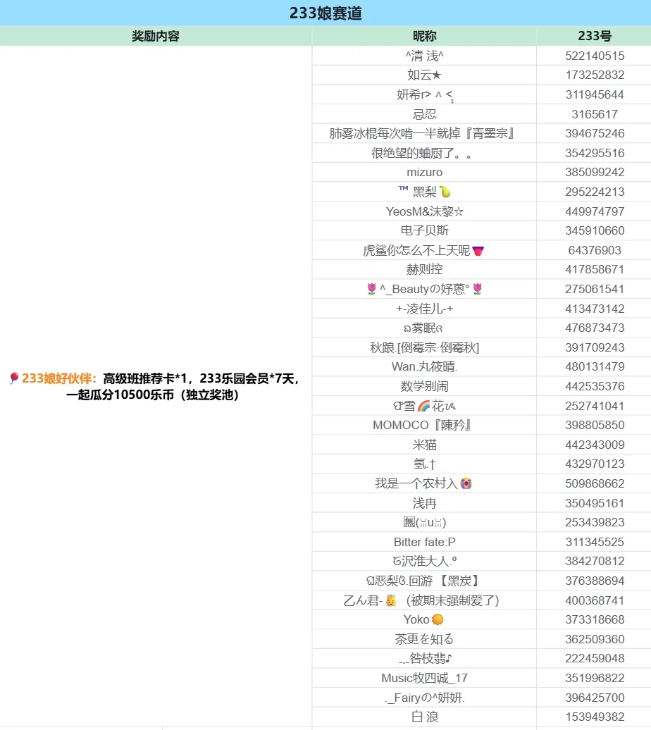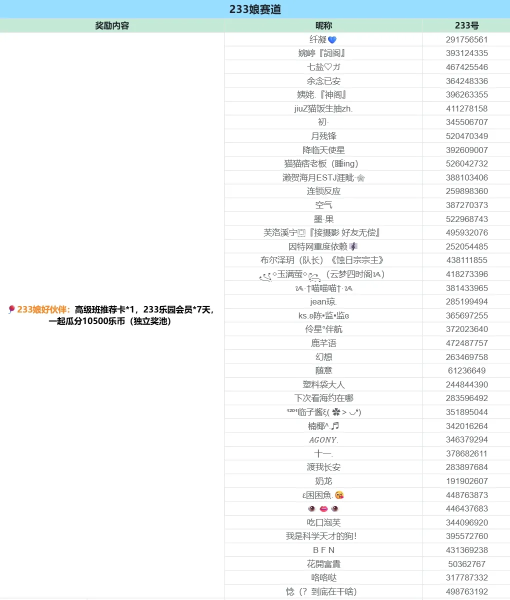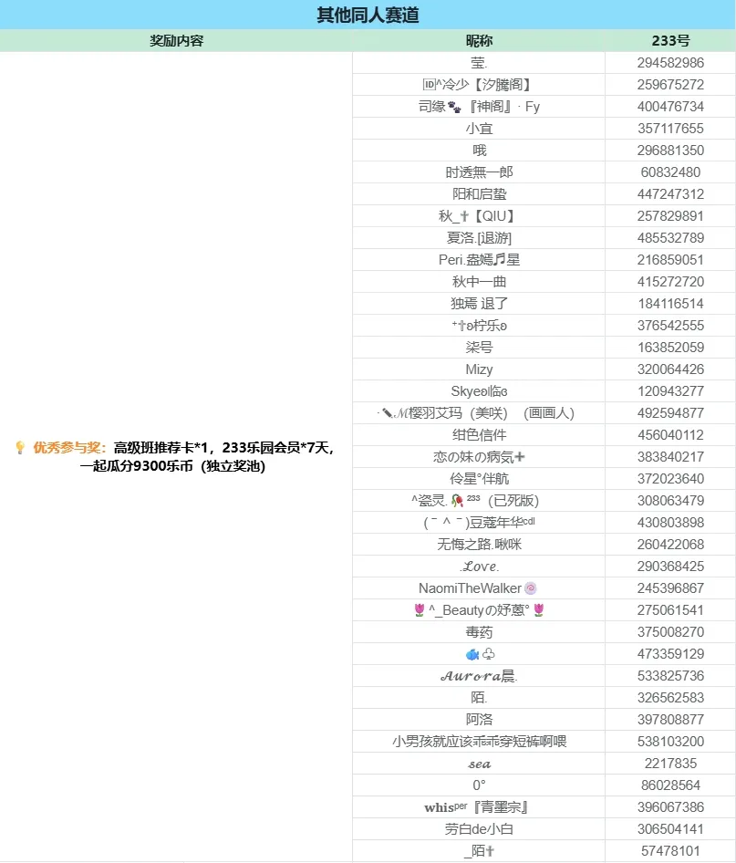 所有符合参与要求的创作者均可获得高级班推荐卡*1,233乐园会员*7天,一起瓜分2333乐币(独立奖池)