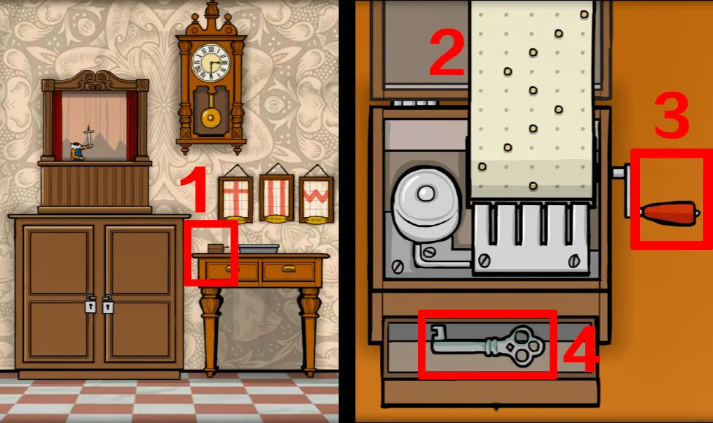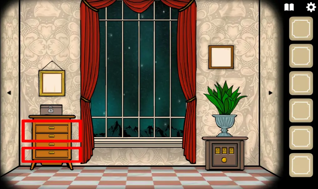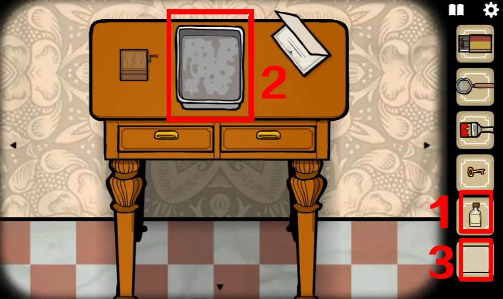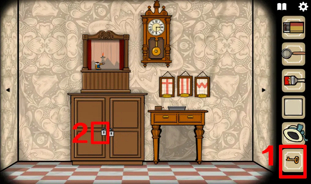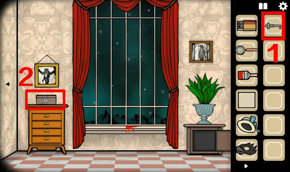 回到这个场景,打开音乐盒,在纸上输入提示的内容,等音乐盒播放完曲子后拿到一把钥匙