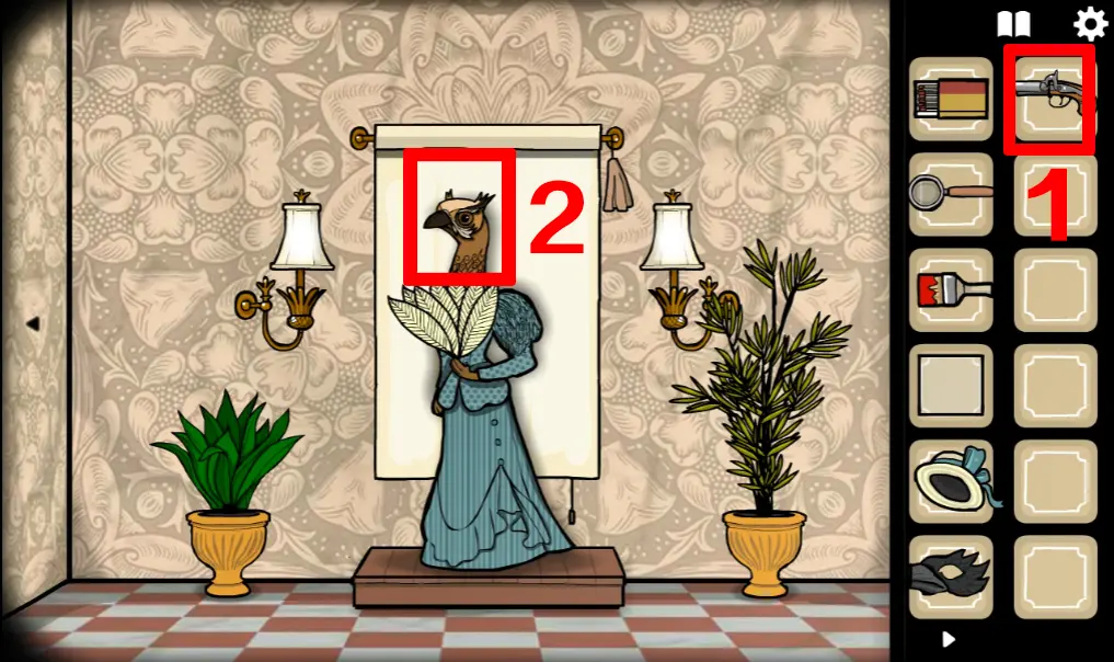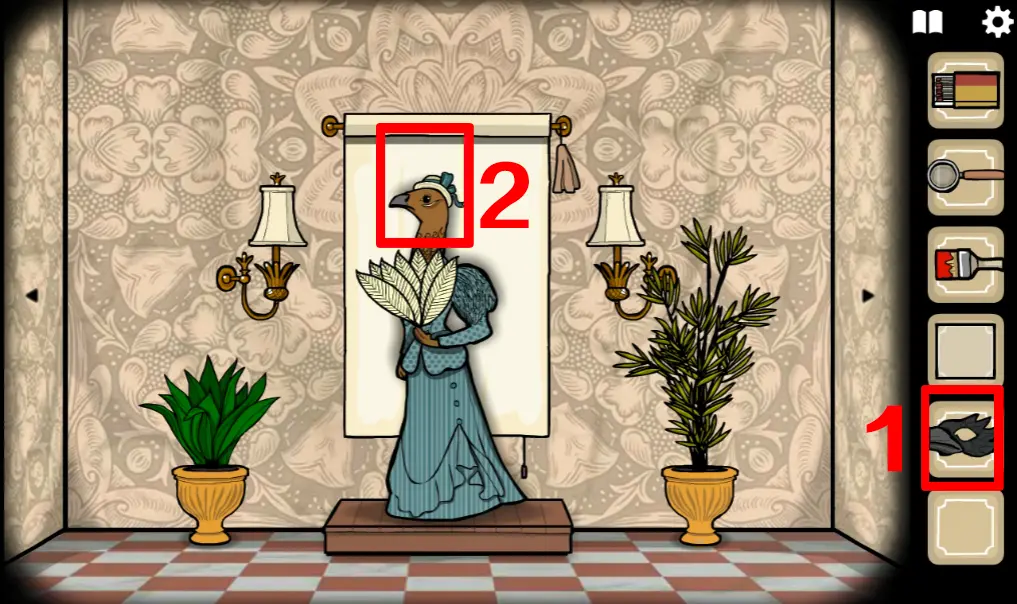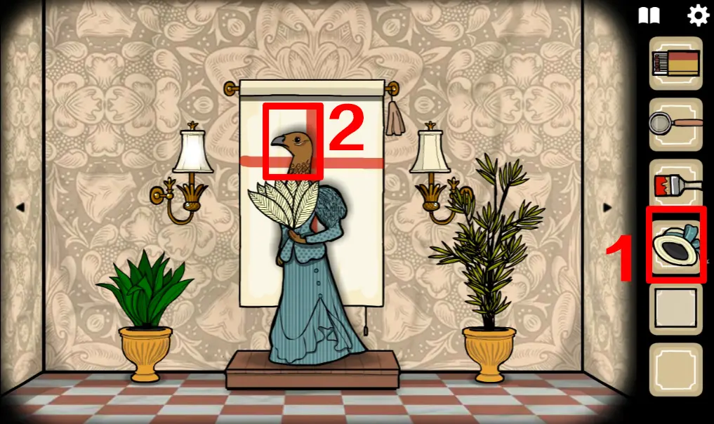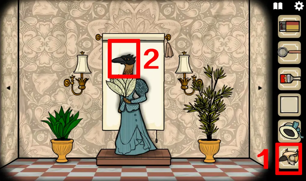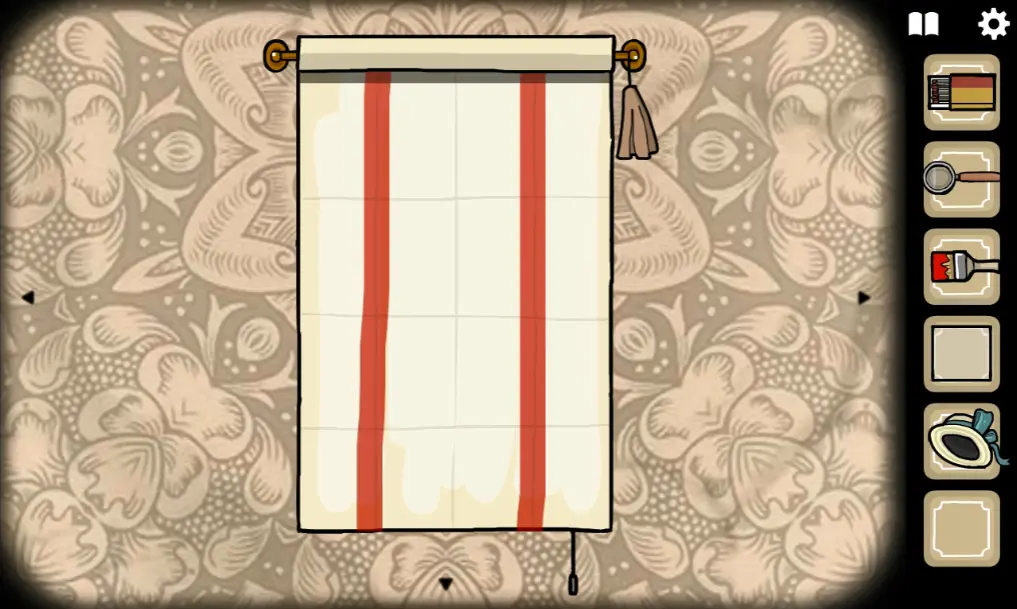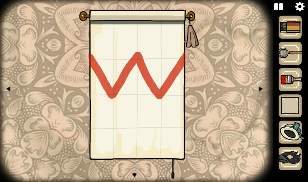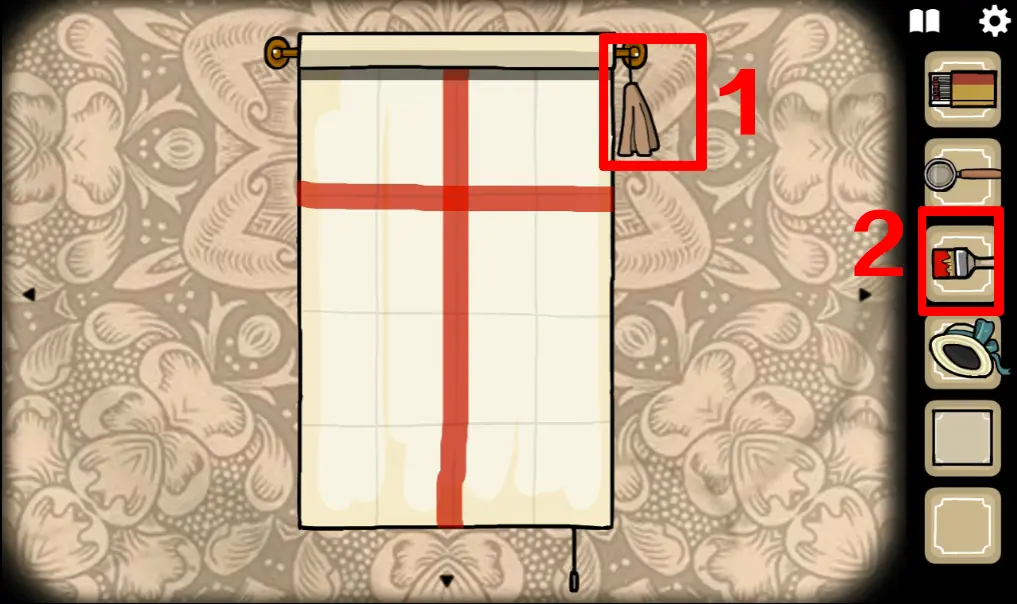 切换回野鸡小姐所在场景,打开她身后的幕布,并用刷子画出一个十字图案,画错的话点右上角流苏可以重置,操作正确野鸡小姐旁边的两盏灯会亮起
