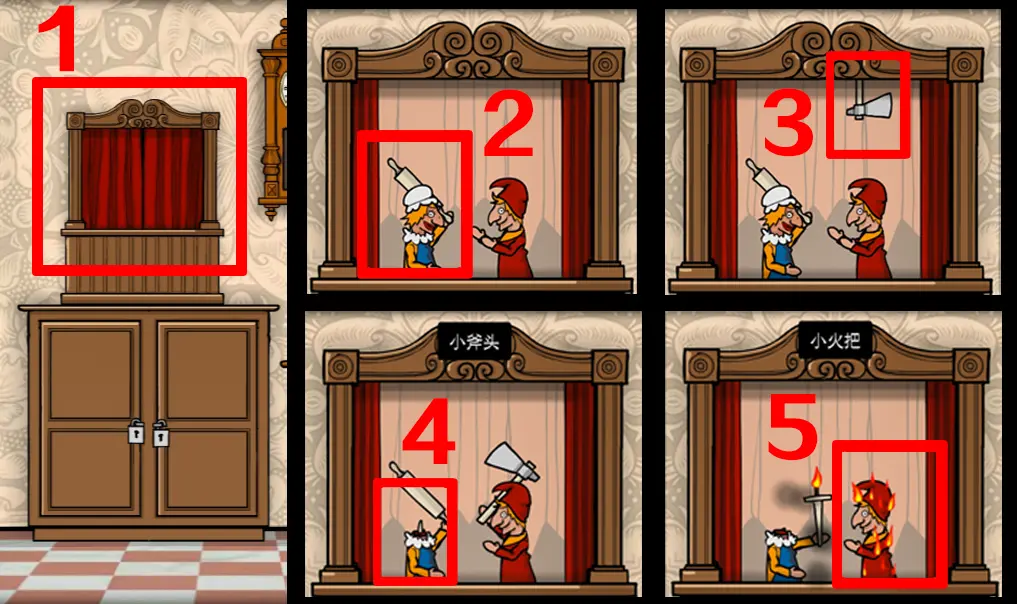 拉开红色帘幕,把擀面杖给左边蓝色小人,不停点他几次会出现一把小斧头,拿到小斧头后交给红色小人,再不停点红色小人