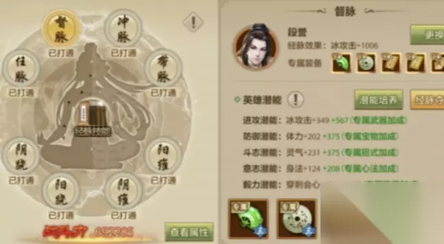 3、替换推荐 当然后期的打造会更加极限,因此我们还得为经脉武魂准备一个替换方案。替换中我们优先选择属性攻击和属性一类,其次是灵气和身法。经脉可以用火攻击,体力,命中和身法。英雄主要选择段延庆,游戏后期可以用无崖子替换古笃诚。 其次6属性2命中依旧是主流玩法,追求极限的属性和命中,可以让输出更加稳定。当然增益属性自然会有所下降,但逍遥值得大量投入属性。