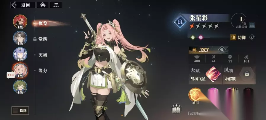 张星彩在游戏中的定位为防御型武将,她来自吴国阵营,同时也是巾帼武将的一员,其天赋效果颇具特色,当任意友方的护盾被耗尽时,自身便能够提升最多10%的行动条,她可以及时为队友提供支援或应对敌方的攻击,而她的绝技更是团队防御的基础效果,可为友方全体施加一层护盾以及星之守护效果。其中,星之守护能够带来 10%的法术免伤提升,不过该效果可以被驱散。