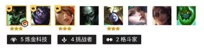 3、运营打法 建议3-2上六级大搜,搜出两星狼人即可存钱卡50追三星狼人。挑战者狼人阵容主要还是看自己的装备,以及三星牌数量,并没有觉对的克制与被克制。 二、格斗枪手 1、阵容组成 金克斯、蒙多、厄加特、杰斯、扎克、蔚、塔姆、风女
