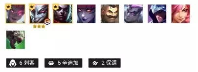 3、运营打法 打法有两种,第一种连败打法3-6拉7人口D30左右差不多一张烬、一张发条、两星日女、两星女枪就不动了,存钱4-2左右拉8D光抢牌,好处就是可以提前D牌好拿牌,装备也很优秀,坏处就是容错低,而且一旦D不到牌容易第八,还有一种正常过渡打法,4-1拉7D牌,好处就是容错高,血量多,但是装备不会很好而且不好抢牌,具体看对局局势来定,请灵活多变。 四、辛迪加刺客 1、阵容组成 阿卡丽、小丑、艾克、婕拉、布隆、诺克、男刀、卡特、老鼠
