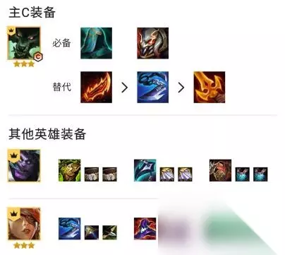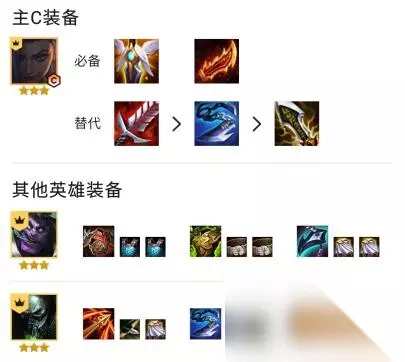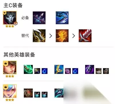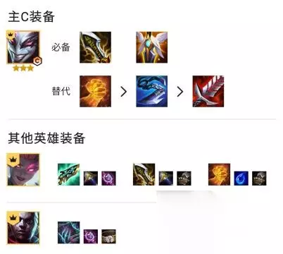 2、装备选择 主C小丑:无尽、复活甲必备,第三件羊刀。替代:正义之手、巨杀、火炮、饮血。副C艾克:鬼书。副C阿卡丽:科技枪、无尽、正义
