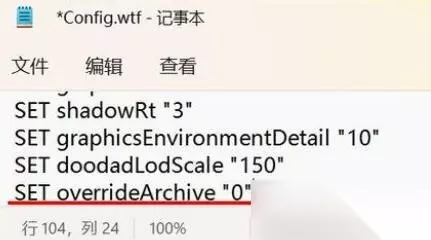 2、然后用记事本打开Config.wtf文件,在文件的最下方添加一句: SET overrideArchive "0" 然后保存、退出即可!