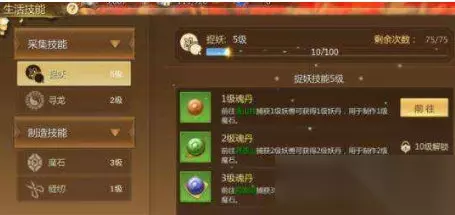 以钓鱼为例在游戏中我们去到成都城内找到姜海去接取钓鱼的生活任务,每天我们可以进行20次钓鱼选择用更好的鱼竿和饵可以提高钓到更高品质鱼类的可能,并且每一次钓鱼还会降低鱼竿的耐用值不过可以通过使用相应的符文进行恢复。钓鱼任务完成后我们可以获得生活经验和一些灵力值还有鱼类和一些调料或者稀有的宠物在暗夜中的半鹰半鳐类生物。得到的各种鱼类我们可以用来制作各种美食,让人物吃下美食可以获得相应的增益效果。我们还可以点开主界面的商店使用钻石或者银币购买高品质的鱼竿或者饵,这样更有可能钓到更高品质的鱼类。