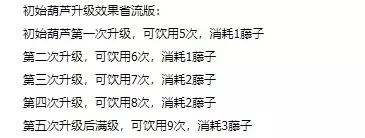 葫芦效果: 简介:药不执方,合宜而用。 品质:特品。 初始葫芦第一次升级,可饮用5次,消耗1藤子,名称药葫芦。 【仙药葫芦】 第二次升级,可饮用6次,消耗1藤子,名称仙药葫芦。 【药王葫芦】 第三次升级,可饮用7次,消耗2藤子,名称药王葫芦。 【药师葫芦】 第四次升级,可饮用8次,消耗2藤子,名称药师葫芦。 【药师佛葫芦】 第五次升级后满级,可饮用9次,消耗3藤子,名称药师佛葫芦。 黑神话悟空第三章有哪些隐藏支线 黑神话悟空第四章有哪些支线 黑神话悟空第五章隐藏地图怎样开启 黑神话悟空隐藏地图紫云山怎样解锁 黑神话悟空无限猴子BUG怎样触发 黑神话悟空boss怎么样打 黑神话悟空宝莲玉葫芦位置在哪 黑神话悟空燃葫芦怎么获得 黑神话悟空湘妃葫芦在哪拿 关于神话的更多文章 黑神话悟空第三章有些什么隐藏支线 黑神话悟空宝莲玉葫芦的位置 黑神话悟空湘妃葫芦的地点拿 关于神话的最新消息,请继续关注233乐园哦, 831号