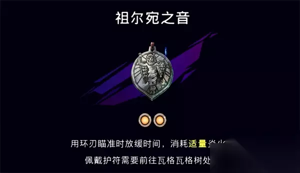 10.祖尔宛之音 祖尔宛之音在环刃瞄准的时候放缓时间,消耗适当的炎火就行,护符的获取方式是打开箱子,隐藏箱子位于下城区地图上双车房间和祈祷雕像房间的中间,是一个过道里面。 获取流程>>>祖尔宛之音护符加成及获取攻略