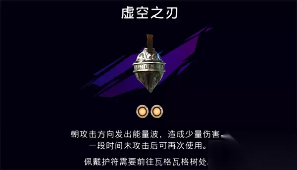23.虚空之刃 虚空之刃能够朝攻击方向发出冲击波,造成一定伤害,并且一段时间没有攻击就能再次使用。虚空之刃护符获取方式是开箱子,位于上城区右上方瓦格瓦格树的下方平台可获得该护符。 获取流程>>>虚空之刃护符加成及获取攻略
