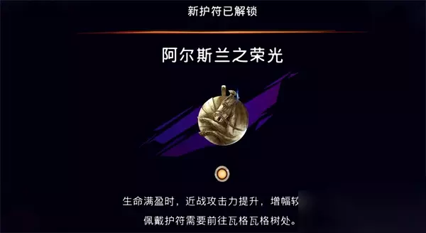 8.阿尔斯兰之荣光 阿尔斯兰之荣光,满血的时候近战攻击力提升,这效果还是很不错的。剧情光芒散去之后,在屏幕上方会有个提示,就是触发支线任务戛弗山的预言,接着会发现右方掉了个东西,掉的东西捡起来就能获得一个护符。 获取流程>>>阿尔斯兰之荣光护符加成及获取攻略