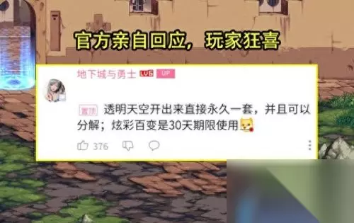 第三个能称得上有诚意的活动,是13周年庆签到第4弹赠送的透明套,那时候虽说“龙袍”已经推出了1年了,但是透明套依然是逼格满满的天空,以至于很多玩家都怀疑不是真的,不是怀疑有期限,就是怀疑奖励是随机3选1。 面对这么多玩家的质疑,连官方都忍不住出来说明了,称透明天空是永久一套的,并且还可以分解,这时候玩家才敢相信是真的。在赠送透明后,很多玩家也是回坑圆了透明梦,虽说后续版本也经常送透明,但惊喜却没有第一次这么大了。