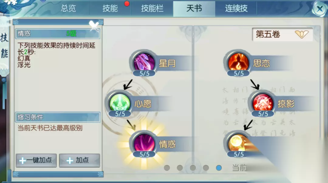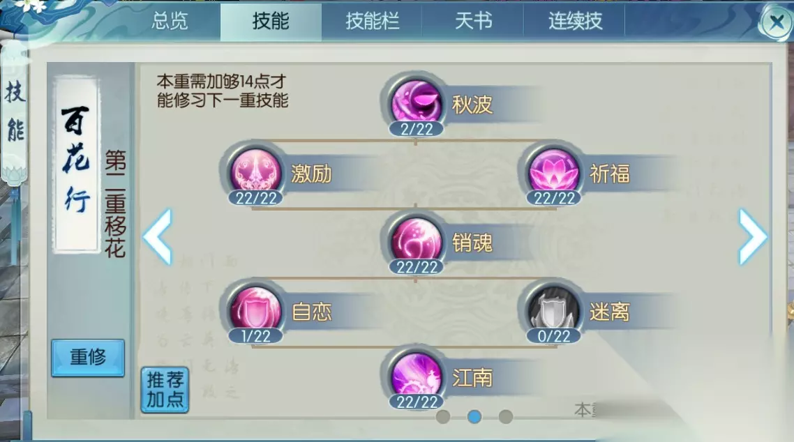下面的技能就要按照所玩的流派选择性的加点了,爆发流的玩家决绝和风花雪月都要加,特别是决绝有攻击和暴击的属性,风花雪月是用来补充伤害的。生存流派的玩家把祈福技能加满,有回血和减伤效果,幻真技能加1级就可以了,在进行闪避时获得一点增益,主要用于团本和高难本中。玩控制流派的玩家把秋波技能加满,可以对群体施加魅惑效果,旧梦技能点个1级就行,可以驱散自己身上的不良buff,在竞技场和帮派战争的时候可以用,人越多越好用。