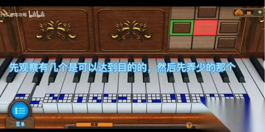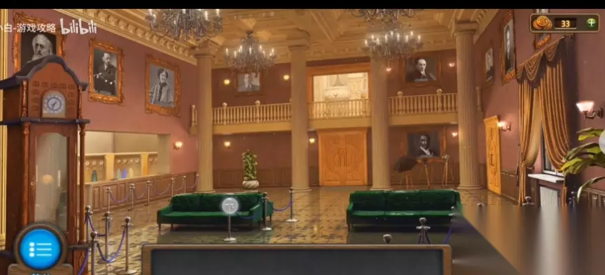 209、在化妆室的椅子上得到[标签3],在左边的裙子下得到[沙袋2],在化妆桌上得到[刷子]和[镊子],并记住化妆镜上灯的位置。 210、回到大厅查看右侧的窗户,用镊子在窗下的门缝中得到标签4。 211、检查左边的更衣室,把四个[标签]放在柜台上,用[刷子]触摸[粉末]得到四个标签上的数字,找到四个标签对应的衣服,记住这四件衣服的颜色是紫色、绿色、红色和蓝色。 212、回到化妆室,检查梳妆台下的抽屉,按照紫绿红蓝的顺序点击抽屉上相应的按钮,打开抽屉,得到[钢琴健3]和[重量]。 213、查看物品栏中的“砝码”,使用“绳索”和“钳子”获得“钟重”。 214、回到表演台,在钢琴上安装钢琴键,完成游戏(小游戏不难,按下每个钢琴键到上面的九宫格子,通过点击不同的钢琴键,使上板块全部选择,完成三次),得到[钥匙]。