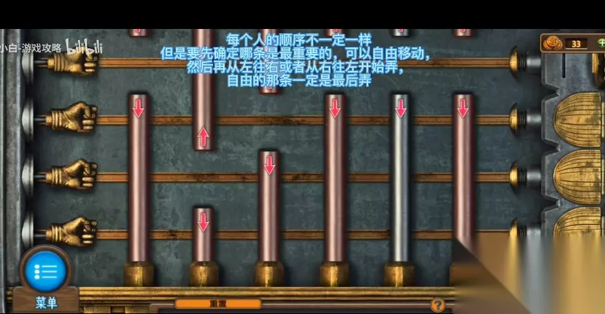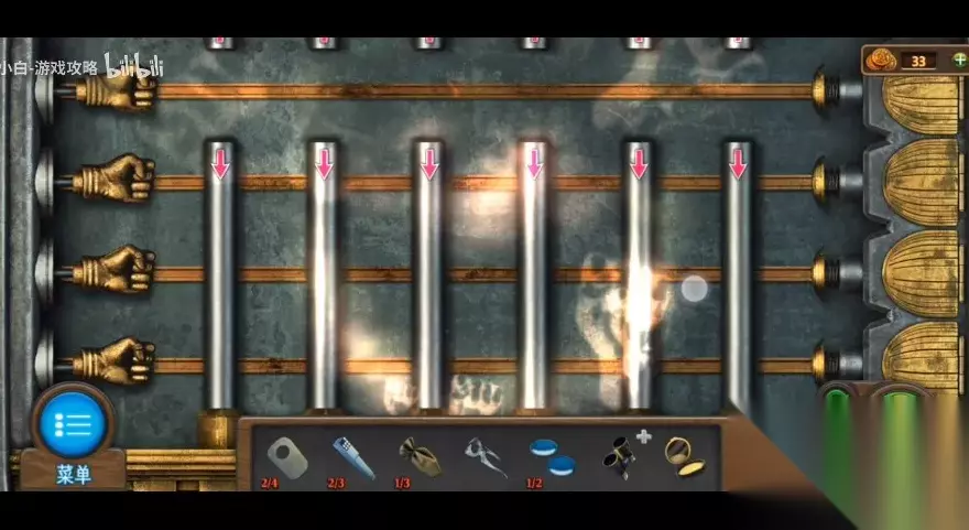 198、查看左侧更衣室,点击观察53号衣服,用刀子取出衣服旁边的钩子。 199、将钩子与绳子结合起来,得到带钩的绳子。 200、来到表演台,用带钩的绳子进入二楼窗台,得到【损坏的双筒望远镜】和【木板2】。 201、从表演台前侧的侧门到过道杂物间,检查楼梯入口的木制工具箱,在工具箱中获得锯子、锤子和钳子。 202、用钳子封住最左侧的门,得到钉子和长木板。 203、回到表演台,再次进入二楼阳台,用钳子打开手提包,得到【粉末】和【钢琴键】。 204、把长木板放在地上的梯子上,用锯子得到两块木板,用木板、钉子、锤子依次修复梯子。 205、将梯子放在左侧第一个探照灯下,用锤子打破探照灯获取钥匙。 206、在地下竖琴中使用钳子获得绳索。 207、返回大厅,点击查看右侧的相机,使用[刀]获取[镜片1]。 208、来到杂货间走廊,点击楼梯入口的门,用[钥匙]打开门,完成游戏,然后进入化妆室(小游戏难度较低,通过上下移动柱,移动一条路,使左铁拳击中右弹簧,点亮右灯,点亮右灯)。