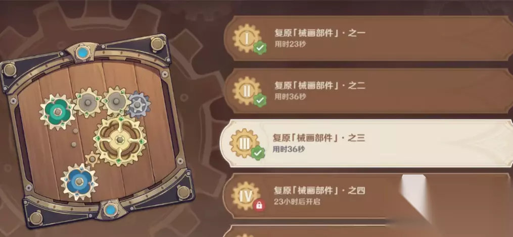 另外再为各位讲解一下原生复原械画部件活动第一天的过关攻略,第一天的方位一使用中号齿轮,方位二使用小号齿轮,方位四使用大号齿轮,方位六使用中号齿轮,其他的可以不用添加齿轮,这样就是完成复原了。过关奖励是六十个原石,三万个摩拉和狮牙斗士的铁链。