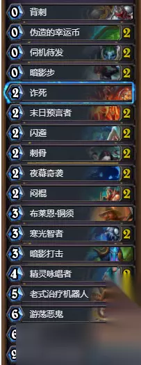 恩佐斯爆牌贼的优势是铺场快,抗性比普通快攻好点,但面对宇宙牧、肉块术、蓝龙德、大哥牧这些卡组就比较吃力。因为1费和3费解牌拖慢节奏,淤泥和328在对面手里根本不够看,甚至可能帮对手过关键牌。 爆牌贼的几个关键点 恩佐斯容易被解,多带几个需要大量回合,非常拖。宇宙牧和蓝龙德可以无视恩佐斯。 占用手牌位置,影响斩杀效果。 多次斩杀前因为淤泥、328、恩佐斯的出现,导致手牌位置尴尬,DK变身后手牌更少。 我们去掉5张恩佐斯,换上2张硬币,让手牌更流畅。暗影步用完后也能做到铜须+3大哥,12费过13张牌的斩杀,配合DK甚至1硬币就能完成。理论最高斩杀是铜须+大哥+后手硬币+DK硬币恢复到8费+双大哥+双暗影步大哥,单回合过20张牌。