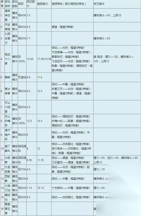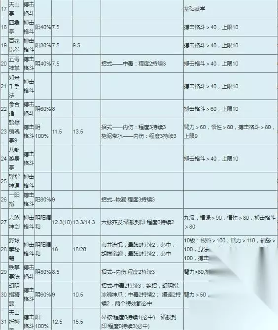 其中的每个武功都是有着不同的类别的,我接下来所说的武功也将按照其类别去进行归纳讲解哦。这里我们先重点的来说说搏击格斗类型的武学 ,第一个是落英的神剑掌法,这套武学需要我们的格斗大于四十的。然后是经典的九阴的白骨爪,这个是需要我们格斗的数值达到六十以上的;其中的降龙掌就需要我们的臂力与格斗都大于一百的,这个招式是有着内伤的特殊效果的,其效果还根据所命中的层数而产生不同程度的伤害的哦;太极拳法是需要我们的臂力以及定力达到六十五,而格斗数值就只需要大于六十即可,这个招式也是有着特殊的招式效果,它可以让敌人有着一个缓慢的不良状态的;还有大金刚的掌法,这个是需要我们的臂力大于七十的,然后格斗数值大于六十,这个如果命中了敌人同样会产生内伤的效果,并且有着三个不同的程度哦;灵蛇的拳法就只需格斗数值大于六十,这个灵蛇则是可以给予敌人一个中毒的效果;擒龙的功法也是只需要格斗的数值达到六十以上的。