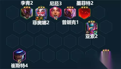 后期成型阵容 亚索和菲奥娜三星之后,就可以开始攒钱升人口,一般只要亚索三星来得不太晚,都可以连胜至少一个阶段。利用连胜带来的经济和血量上的容错,可以提升等级给亚索开6决斗羁绊。 6决斗羁绊现在带有百分比减伤效果,对于亚索此类近战C位来说,是非常实用的效果。