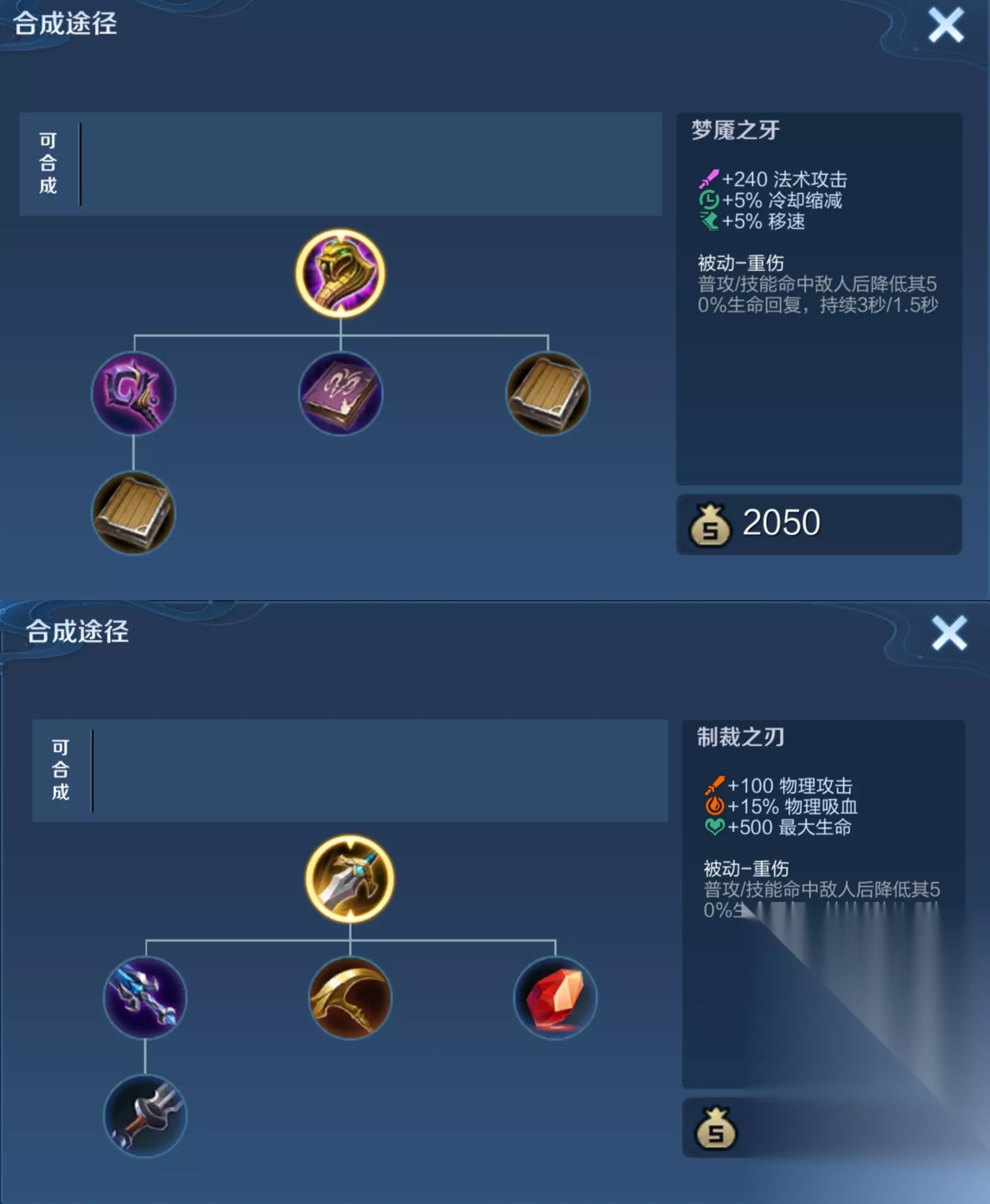 二、出装克制: 1、制裁之刃或者梦魇之牙。这两件装备对芈月进行克制,这两件装备的效果都是造成伤害后降低目标50%的生命回复效果,芈月吸血能力降低之后,基本上在团战中发挥不了什么作用