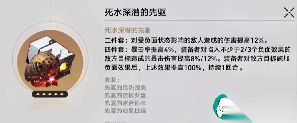 崩坏星穹铁道黄泉遗器建议选择哪个 先驱系列遗器搭配: 死水深潜的先驱套装是黄泉的一大选择。二件套可提高对目标负面影响敌人的伤害值,四件套则提高暴击率和效果提升百分比。 先驱的绝热围壳、先驱的虚极罗盘、先驱的密合铅衣、先驱的泊星桩锚,这些都是先驱系列遗器的组成部分。