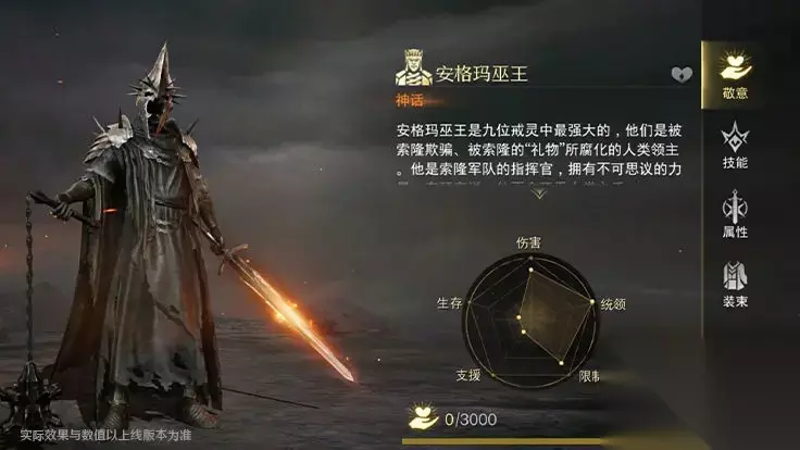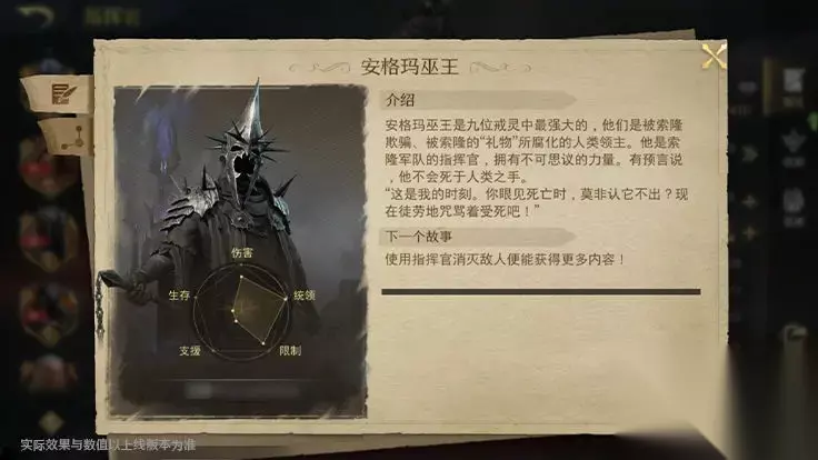 【属性技能介绍】 安格玛巫王的指挥风格独特且残暴,擅长利用地形和敌人的弱点发起突袭。游戏中,他拥有较为出色的统领、伤害和限制属性。