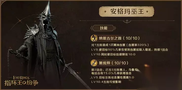 技能 纳兹古尔之首 对1方阵造成1次物理伤害(伤害率320%) LV5:使目标50%几率在受到伤害后陷入昏迷,持续1回合 LV10:同时使目标防御力降低10 黑统帅 前2回合,己方3方阵兽人、乌鲁克、邪恶人类、巨魔兵种,每回合有75%几率获得连击 LV5:目标方阵攻击属性提高5 LV10:4方阵均受影响