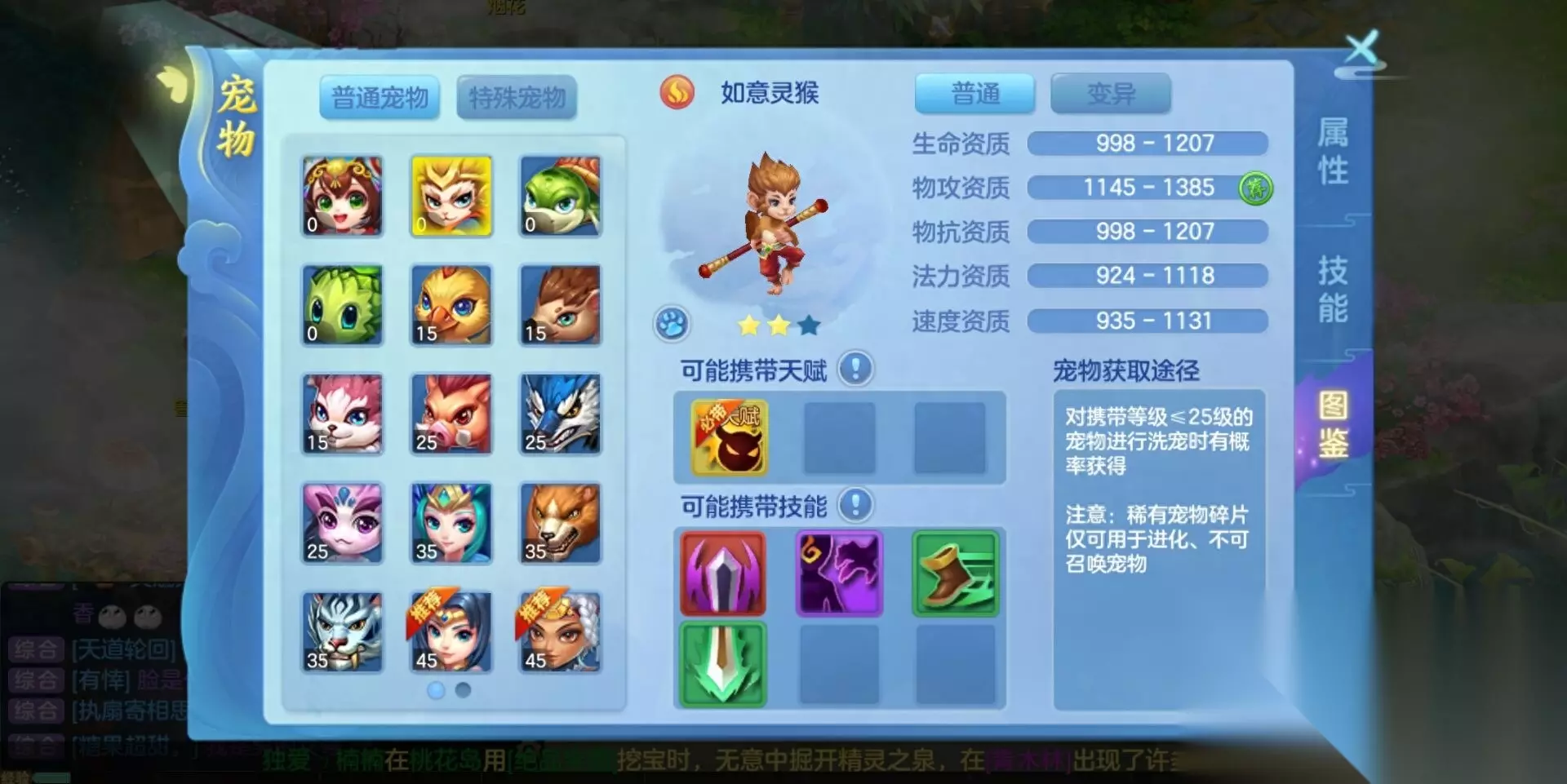 随着不停地游玩这款游戏,大家可以看到,从开局任务导航就开始带着大家抓属于自己的宠物,从最开始的毛草团、梦想企鹅、锦毛鼠等到后来角色等级达到服务器上线时送的炎剑士和稀有宠物如意灵猴等等,这么多宠物在战斗的时候却只能上场一只,就会让大家十分苦恼,前期资源本来就不多,不知道培养什么。其实,在游戏初期也就是刚进游戏的时候大家只需要根据游戏提升抓了宠物之后就用系统给你抓的宠物,这时大家要注意了,千万别拿活动中送的还童丹、洗宠卷以及召唤兽经验等道具去给这类宠物使用,比如毛草团和梦想企鹅,因为这些属于前期过渡用的宠物,后期是用不到的。