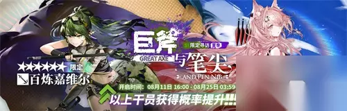 明日方舟夏活限定卡池介绍 活动时间:08月11日 16:00 - 08月25日 03:59 寻访数据契约交换所开启时间:08月11日 16:00 - 08月28日 03:59 注意: 1、本次卡池【巨斧与笔尖】为限定寻访。 2、本次限定卡池将会复刻去年的夏日限定角色:假日威龙陈。 3、本次限定卡池结束后[百炼嘉维尔]将不会加入常规卡池,直至2023年7月1日之前不会上线。 4、其它新增角色在活动结束后将加入常规卡池。