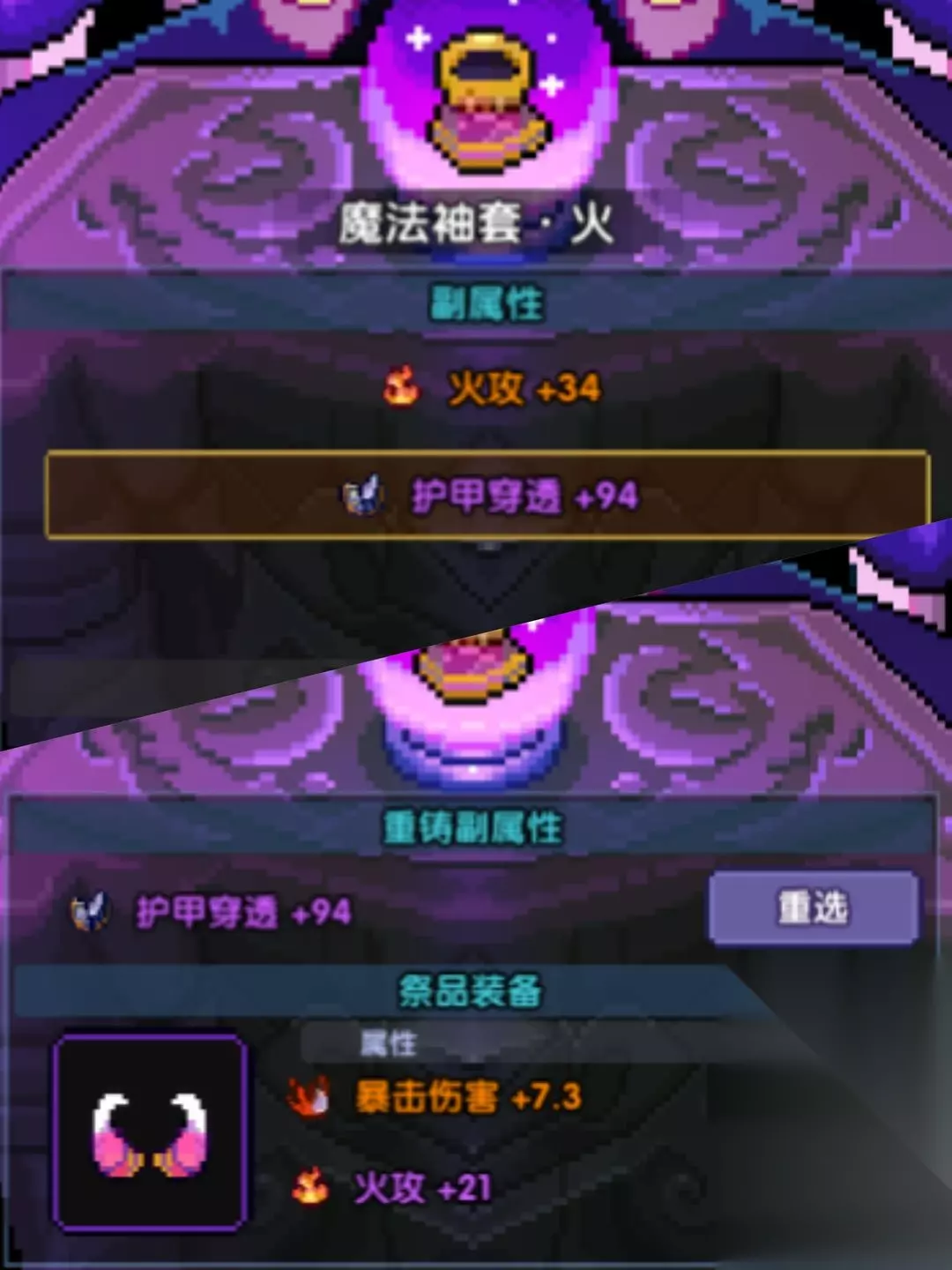 【重铸方法】 重铸方法大体可以分为两种 1、单属性狗粮材料 使用单属性狗粮重铸没什么好说的,40%概率赌运气(也可以相信下玄学,先垫几下) 2、双属性狗粮材料 重点来了 使用双属性狗粮重铸时候有个机制,当你的狗粮上的其中一条属性和胚子上的一条属性种类一致时,洗练另一条属性的成功概率为70%,入下图所示