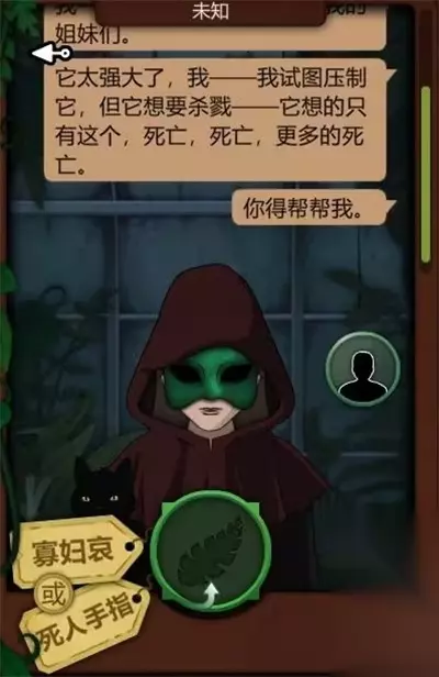 第15天,翡翠面具女人(【仆人】掌控者)来访,选择给予【寡妇哀】,弱化其意志,无法控制【仆人】。