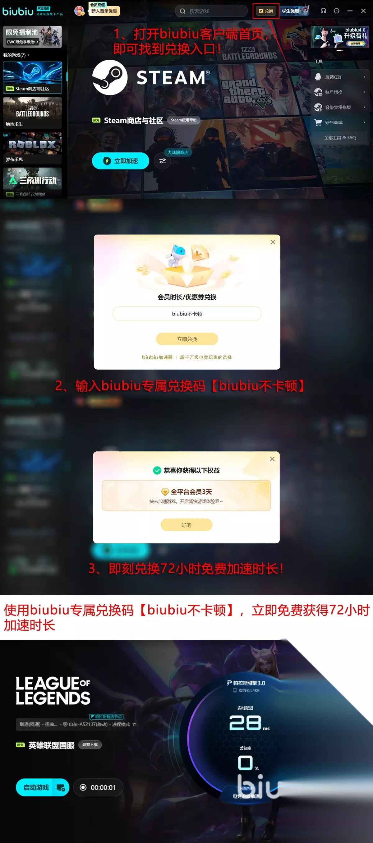 而作为阿里巴巴灵犀互娱大厂技术加持下的水平,整个专业团队也在不断的升级和强化性能,对比杂乱无章的小平台来说,这里除了使用稳定之外,也为普通用户谋取到了更多的福利,就比如首次来biubiu注册登陆你就能得到24小时免费加速时长,后面新老用户输入兑换码【biubiu不卡顿】即可再领取72小时,两个算起来都达到了96个小时,足矣让你在整个假期都能畅玩。