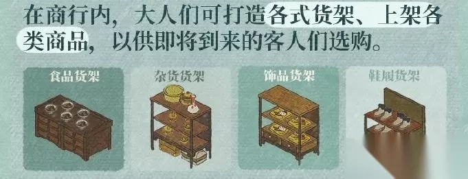 商行的货品靠绍兴府的特殊生产设施生产。满足客人采买需求和满意度能得商行口碑、碎银。货架合理布局,延长采买路线效果更好。 夜航船每周三、六晚七点到十二点开放,听故事能拿奖励。