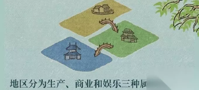特色玩法是地区连接,解锁新区域前得建桥。地区分生产、商业、娱乐三种属性。 越州商行要修复废墟,完成后点建筑进入。商行能打造食品货架、杂货货架、饰品货架、鞋履货架。