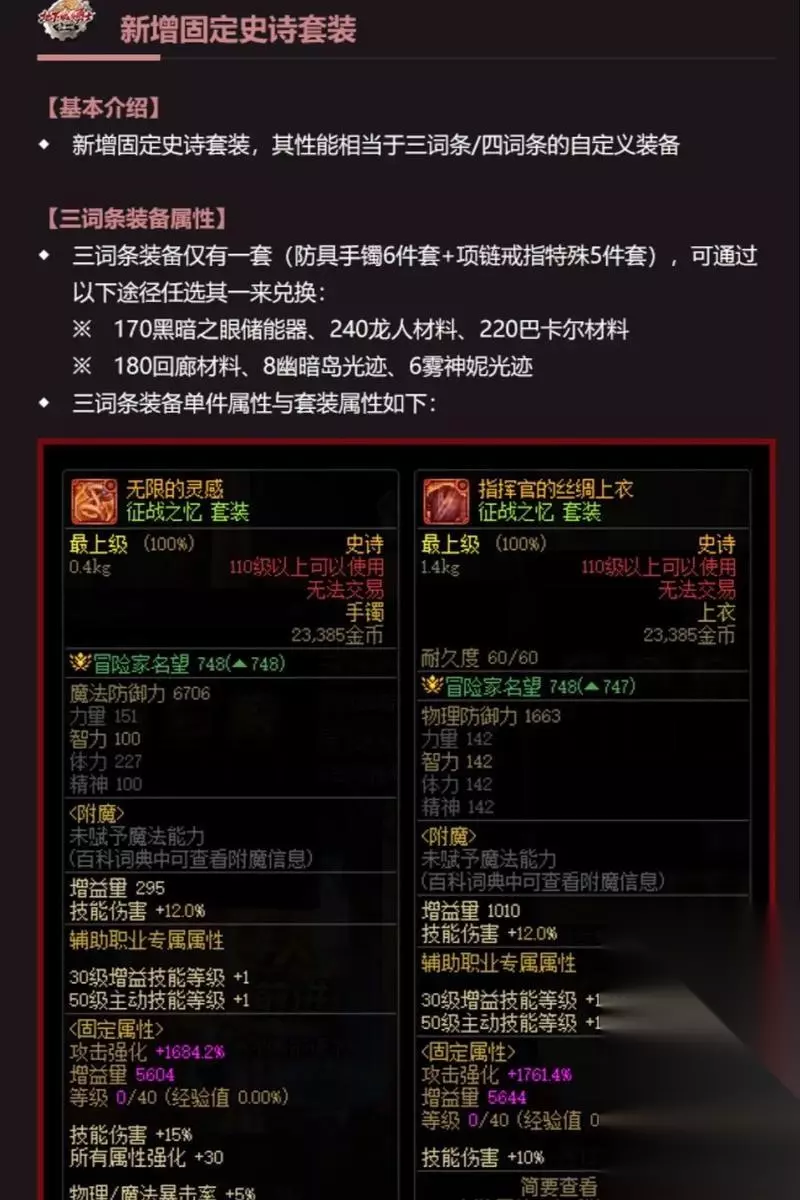 在《地下城与勇士》(DNF)中,角色成长与装备选择密不可分,良好的装备是提升战斗力和提高刷图效率的关键。本文将为你提供全面的成长角色装备选择建议,以及装备更换的最佳时机。 一、成长角色装备选择建议 1.1装备选择原则 对于成长中的角色来说,选择装备应以性价比为先,强调实用性与经济性的平衡。初期应注重基础属性,如力量、智力、体力、精神等,这些直接影响角色的攻击与防御。 1.2了解装备等级 DNF中的装备分为普通、稀有、神器、传说和史诗等级。普通玩家应根据自己的游戏进度和经济条件,选择合适的装备等级。 1.装备的属性包括固定属性和随机属性。成长角色应优先选择固定属性好的装备,如增加技能等级、技能伤害等。 1.4考虑装备兼容性 装备需要与角色的技能、职业特点相兼容。了解自身职业的核心技能,选择能增强这些技能的装备。