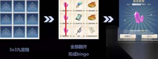 玩法简介 1、活动时间 本次预抽卡活动的整体持续时间是8月28日至10月10日,其中8月28日至9月28日是抽卡时间,而9月15日至10月10日是兑换奖励的时间。所以参加的小伙伴需要注意,虽然活动持续到10月,但实际的抽卡时间只有1个月。 2、游戏形式 游戏的玩法是类似于九宫格翻牌的形式,每次需要消耗一张3x3的九宫格卡片进行游玩。把九个格子全部翻开后,如果某一横向、竖向、斜向的连线图标均为相同时,则达成bingo,获得对应奖品,并存入置物栏。