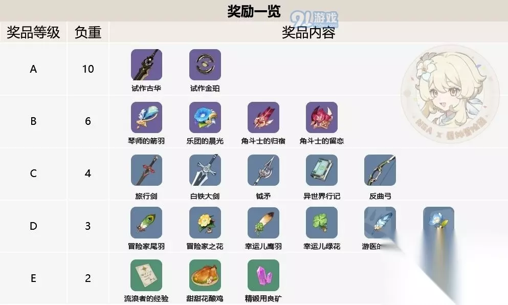 每天最多获得三张九宫格卡片,分别是登陆领取两张+分享活动领取一张。卡片是不做累积的,所以当日的卡片一定要全部用完,否则第二天会被清空。 3、奖品内容 奖品一共分为五个档次(A、B、C、D、E),其中A档奖品最为稀有,而E档奖品最普通。不同档位的奖品负重是不同的,关于负重机制,之后会详细说明。