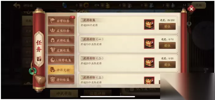 获取神将卡的第二种方式就是通过神武宝箱获取,在日常任务页面有一个神将兑换的板块,玩家每完成一个收集任务就会获得一个神将宝箱,打开之后就可获得一个未拥有的神将卡了,这些收集任务包括武将升级,武将升阶等等,打开宝箱之后,如果人家已经拥有了所有的神将将,则会自动转换为10000个功勋。