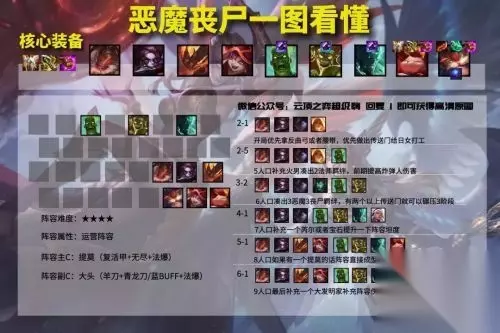 阵容推举: 克烈、波比、凯南、露露、火男、努努、瑞兹、提莫、大头 阵容羁绊: 5小恶魔3丧失1驯龙大师2秘术 装备推举 装备推举 提莫: 复活甲+法爆+无尽 提莫的装备出法建议是传统的AP流出法,法爆+无尽,或者法爆+帽子毕竟提莫也是一个AP型的输出选手。最后一件装备建议复活甲,保证提莫的容错率,虽然提莫能够复活但是复活后会降星而且没装备,真的没啥用。 大头: 羊刀+青龙刀+法爆 大头的神装是羊刀、青龙刀和法爆/正义之拳,羊刀和青龙刀能够让大头快速触发召唤物的技能打出成吨的AOE,大头的装备不用刻意做后期有什么蓝量装和法强装都可以,像蓝BUFF或者帽子都是不错的选择 3丧失: 2白1黑传送门 丧失羁绊的关键就是传送门,最佳的搭配是2白1黑,黑传送门虽然可以带来爆破的效果,但是在后期白传送门才是阵容坦度的关键。后期只要环绕着提莫做防护,那么就不缺黑虫子这点损害了 阵容解析