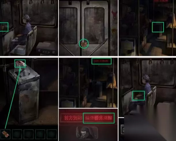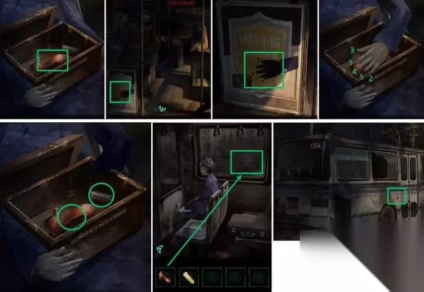 2、点击小盒子,点击高跟鞋子,依照【无名指、小指、大拇指、中拇指、右手无名指】顺序扒开女手,取得高跟鞋子和焟烛,再用高跟鞋砸烂车窗玻璃,逃离公共汽车,随后点击紧急开关按钮,汽车车门开启。