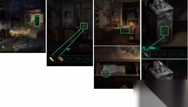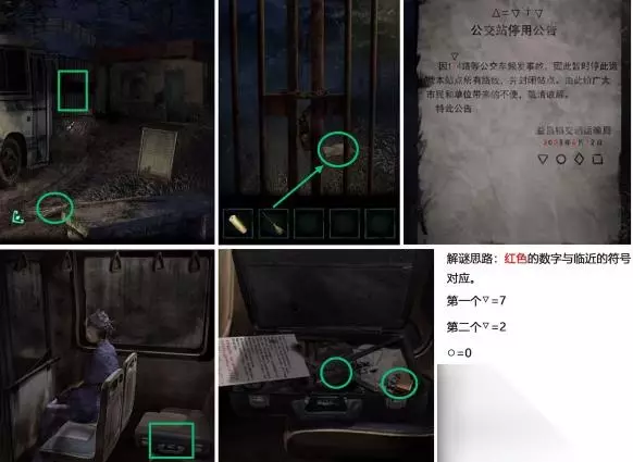 3、去小屋子那边,取得扫帚,点大铁门,去扫帚去勾里边的纸头,得到公交车站停止使用公示,依据上边提示(△=▽ ▽其实就是2 7=9,○=0,◇=8,□=1),打开密码箱,得到火机、红圆珠笔芯。