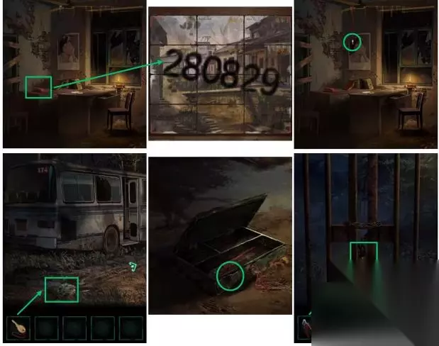 8、点击话机,键入拼图图片里的号【280829】,去取绑锁匙,用锁匙开宝箱,从盒子里取得剪子钳,最终用剪刀剪钳弄断大铁门里的枷锁,进行第一章。