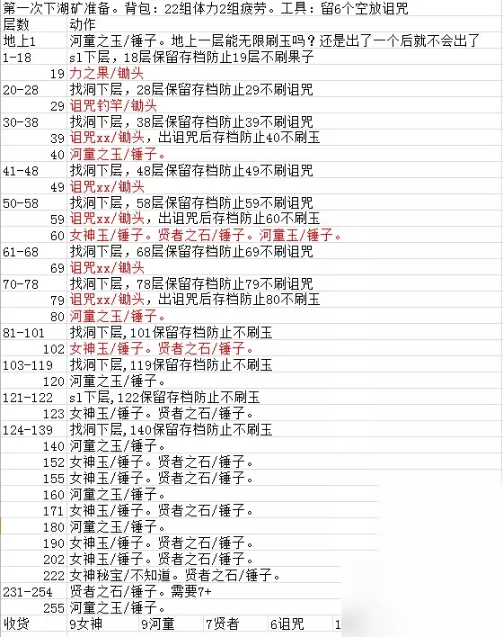 1、矿洞设定 新版中在矿场挖地或走动有一定几率会出现矿洞,如果是直接走上矿洞会掉落下去,有点像地雷是触发,但可以通过挖地的方式提前查看这一个格子是否是矿洞,只要不踩上去是不会掉落的。 2、矿洞掉落层数具体掉落的层数在1-5层之间,我个人从泉水矿场挖到255层,暂时没遇到掉落超过1-5层的情况,就姑且认为矿洞的设定会在1-5层之间进行随机掉落。 3、矿洞的体力消耗 矿洞掉落所消耗的体力还是比较多的,肯定比S/L大法一层层挖耗体力,不过值得一提是由于背包的改动,现在挖矿可以带很多很多体力药,所以体力问题对挖矿并没有太大的阻碍,而且给我们提供了新的挖矿思路,就是通过S/L大法配合矿洞,急速掉落。 本作中体力设定开局就数据可视,所以以下的体力研究数值是非常准确地。 经过多次反复试验,掉落层数和消耗体力之间是固定的关系,对应如下: 矿洞掉落1层消耗体力20点; 掉落2层消耗体力30点,15点/层; 掉落3层消耗体力40点,13、33点/层; 掉落4层消耗体力60点,15点/层; 掉落5层消耗体力70点,14点/层; 所以嘛,性价比最高的是掉落3层,其次是掉落5层,而只掉1层是最坑爹的。